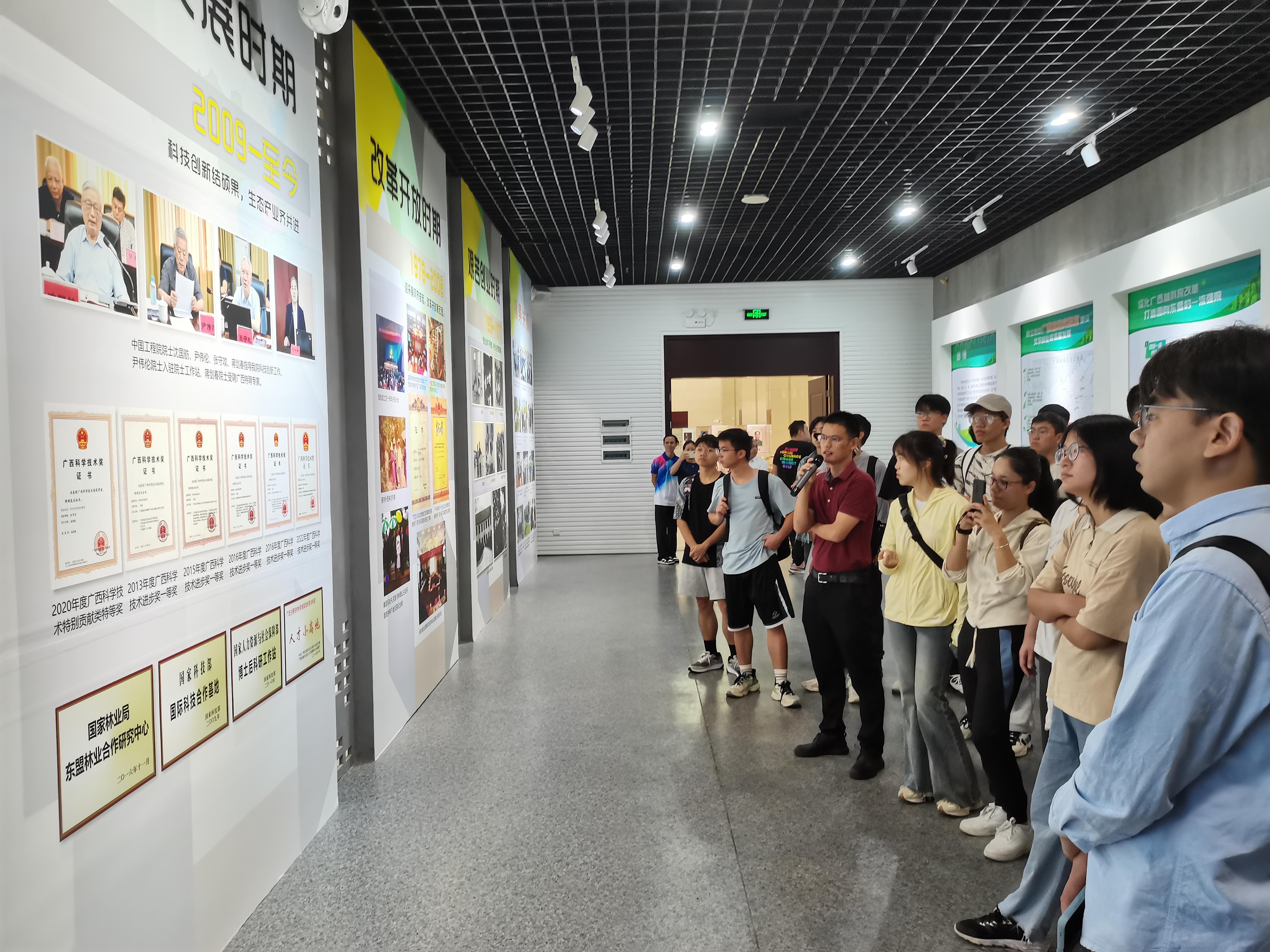 现场,广西林科院邓小军副主任带领同学们到科技成果展览馆进行参观学习,并对林科院的发展历程以及主要科研成就进行详细讲解,使同学们深刻学习了广西主要经济树种松、杉及桉树的用途以及广西各类珍贵树种的保护、开发,进一步促进同学们对专业知识的深度理解和掌握。