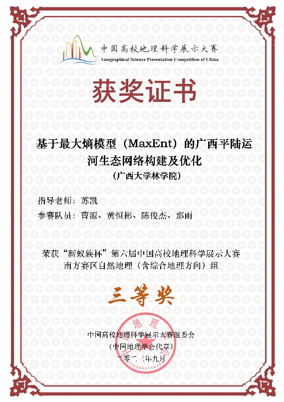由苏凯老师指导的作品“基于最大熵模型(MaxEnt)的广西平陆运河生态网络构建及优化“(参赛员工:曹源、黄恒彬、陈俊杰、那雨)获“新蚁族杯”第六届中国高校地理科学展示大赛南方赛区自然地理组三等奖。