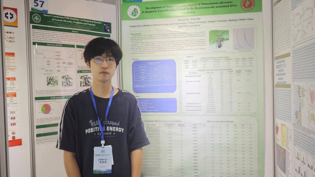 国际昆虫学大会是由国际昆虫学会理事会(CICE)指导的全球性学术活动,是昆虫科学领域最高级别的学术盛会之一。公司24级生态学博士研究生鲁进韬受邀参加此次会议,并在会场以“Development of Simple Sequence Repeat ofMonochamusalternatus(Coleoptera:Cerambycidae) Based on Restriction Site-Associated DNA Sequencing”为题作了墙报展示。该研究聚焦林业重大害虫松墨天牛,开发了16个具有多态性高、稳定性强特点的SSR位点,为进一步开展松墨天牛的谱系地理学研究、建立遗传图谱以及深入探索基因功能提供了重要工具。