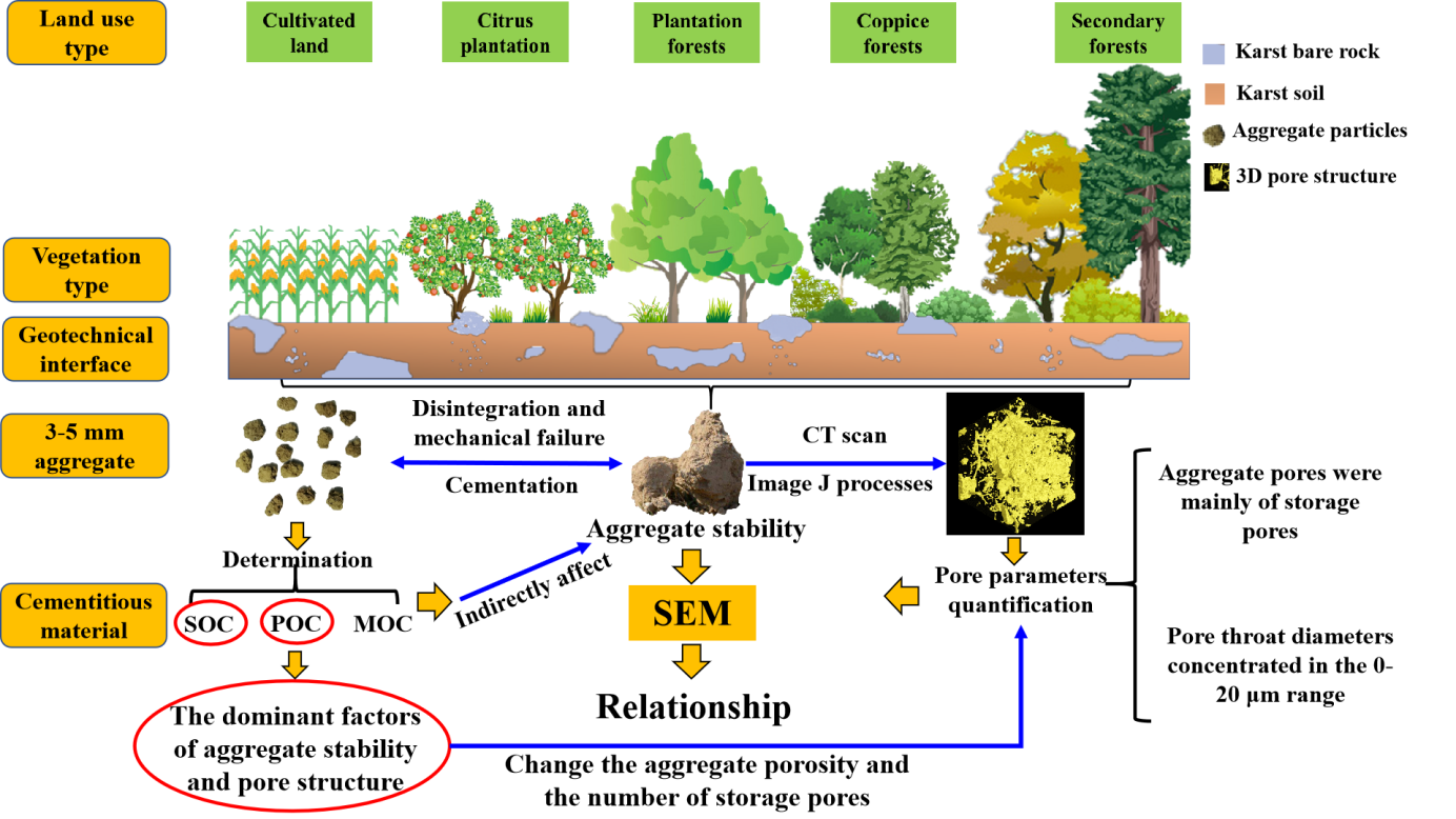 对此,公司研究团队提出科学假设:喀斯特地区不同土地利用类型下土壤胶结物质含量可能通过影响其孔隙内部结构,进一步造成团聚体稳定性差异。为验证这一假设,研究团队通过CT扫描耕地、果园、人工林、灌木林以及次生林5种最典型土地利用类型的土壤团聚体内部孔隙结构,开展不同土地利用类型中土壤主要胶结物质包括有机碳、团聚体孔隙结构以及团聚体稳定性特征分析,并结合结构方程模型(SEM)对各变量间的耦合关系进行定量分析(图1)。