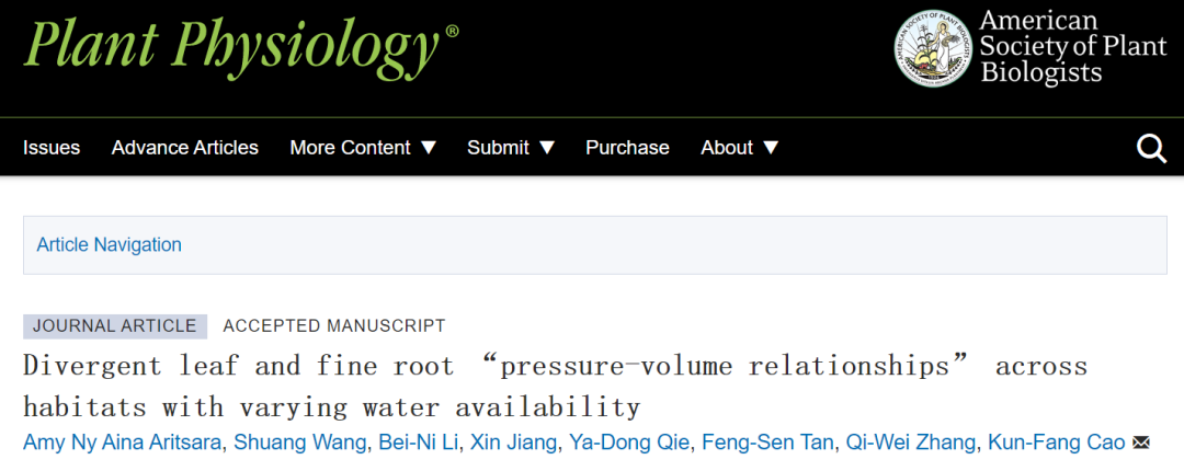 近日,3044永利集团官网“亚热带农业资源保护与利用国家重点实验室”植物生理生态与进化课题组曹坤芳教授团队在Plant Physiology发表了题为Divergent leaf and fine root“pressure-volume relationships”across habitats with varying water availability的研究论文,揭示了不同生境木本植物水力“熔断”机制。