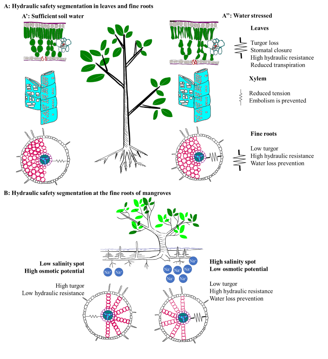 研究人员比较研究了喀斯特、红树林和不缺水的同质园三种不同生境中木本植物细根和叶片对缺水的脆弱性,验证假说:细根膨压的损失点发生在茎木质部栓塞和叶片膨压损失点之前,从而保护茎干和粗根运输通道免受水力失败甚至崩溃的风险。他们测量了三个生境共37种木本植物叶片和细根的压力-容积曲线、以及其中17种枝条木质部栓塞脆弱性,对比分析了器官间的水分关系和水力性状,探讨它们对生长生境适应特点。结果表明:(1) 37种木本植物中,有32种植物细根丧失膨压的水势高于其叶片,即土壤水分亏缺时细根首先失去膨压,与土壤分离,防止土壤向植物体夺水。细根萎蔫水势发在枝条木质部损失50%导水率的水势之前,从而防止木质部运输组织发生严重气穴栓塞。(2)与喀斯特植物和同质园植物相比,红树植物叶片肉质化,具有高抗萎蔫特性、高储水能力和较低比叶面积,它们的细根也一定程度肉质化,具有较高比根长和水容,柔软而细长的细根利于红树植物根系寻找盐度较低的微生境。(3)喀斯特植物叶片多为硬叶,具有高弹性模量和低水容,它们的细根抗萎蔫能力强。