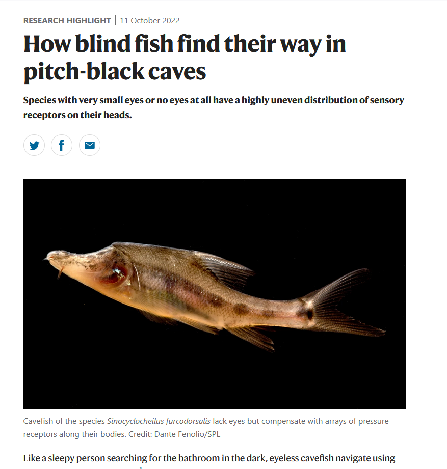 3044永利集团马德华(Madhava)课题组,在生物学领域期刊《Proceedings of the Royal Society B: Biological Sciences》正式发表题为“Sensory evolution in a cavefish radiation: patterns of neuromast distribution and associated behaviour in Sinocyclocheilus (Cypriniformes: Cyprinidae)”的研究论文,这一成果也受到了Nature杂志Research Highlights的报道宣传。