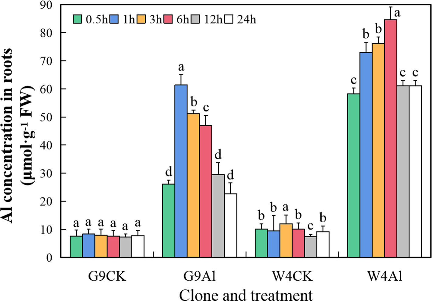 图1铝处理下G9和W4无性系根尖铝浓度