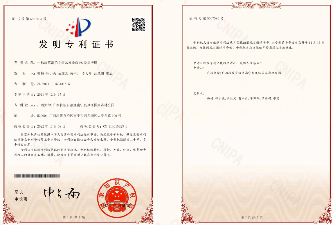 根据前期的调查研究和试验发现,望天树在幼苗时根系生长缓慢,侧根不发达,进而使其在幼苗时期生长迟缓,抵抗力弱,死亡率高,磷素对根系的生长发育至关重要,解磷微生物是提高土壤有效磷的主要途径,所以从望天树人工林中分离、筛选高效解磷细菌,是解决望天树苗期和幼树根系发育迟缓、生长缓慢的问题的有效办法。因此,杨梅教授团队从上述溶磷细菌中挑选既能溶解有机磷,又能溶解无机磷的高效功能菌,成功申请了国家发明专利。从而可提供一种唐菖蒲伯克霍尔德菌(Burkholderia gladioli)P8,用于将土壤中难溶性的磷转化为可以被植物吸收的有效磷。该菌株现保藏于中国微生物菌种保藏中心管理委员会普通微生物中心(简称CGMCC),保藏登记号为CGMCC No.22825。(该成果以“一株唐菖蒲伯克霍尔德菌P8及其应用”为发明名称获得国家知识产权局授予的专利权。发明人:杨梅、韩小美、余注光、黄平升、李万年、汪丛啸、廖思。专利号:ZL 2021 1 1531315.5)。