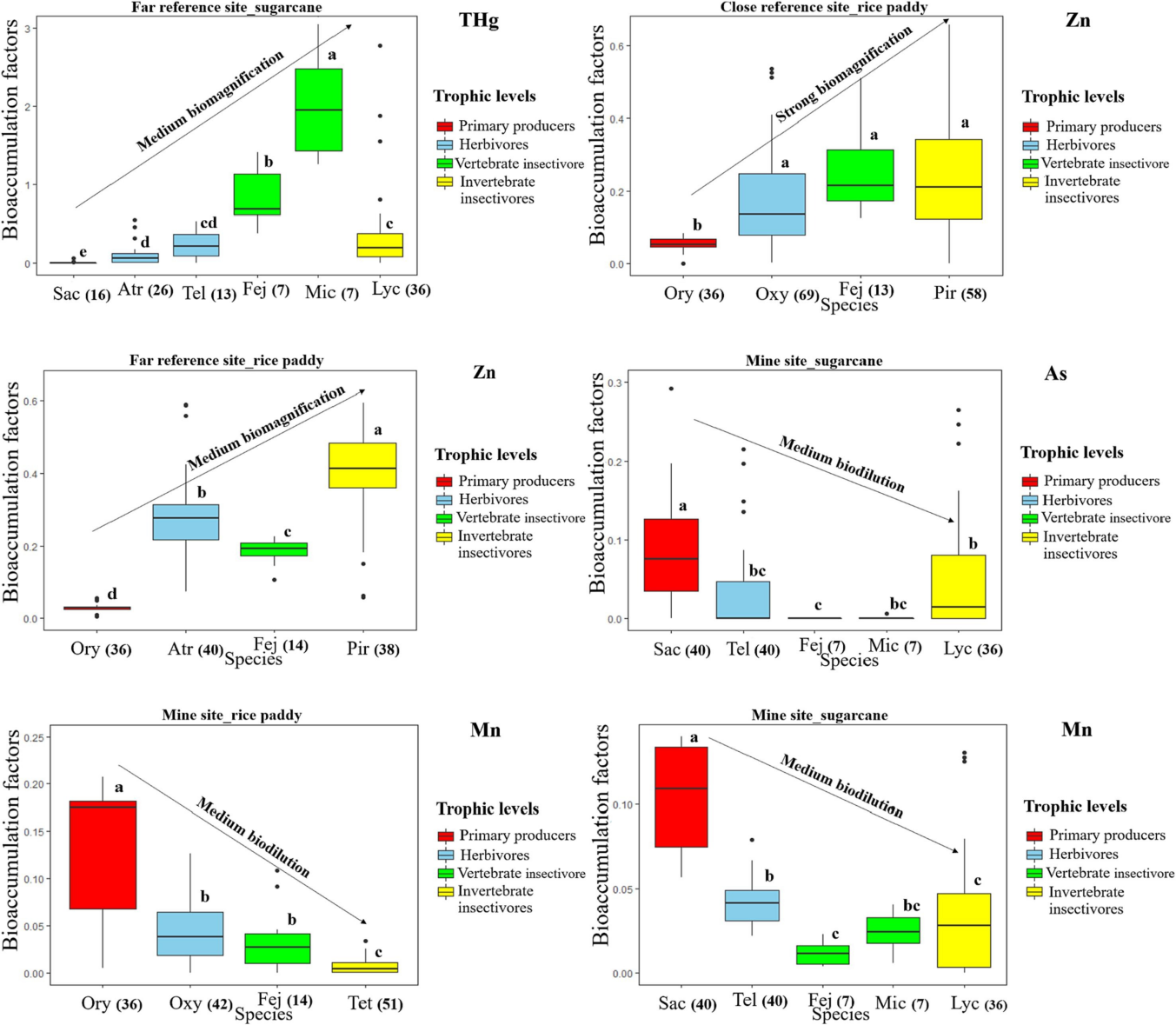 研究结果表明,金属Hg和Zn存在较强的生物放大模式,Cd、Cr、Cu和Pb呈现中等生物放大模式。As和Mn存在明显的生物稀释现象。与甘蔗农业生态系统相比,水稻农业生态系统对6种金属(Cr、Cd、Cu、Hg、Pb和Zn)具有更明显的生物富集模式。