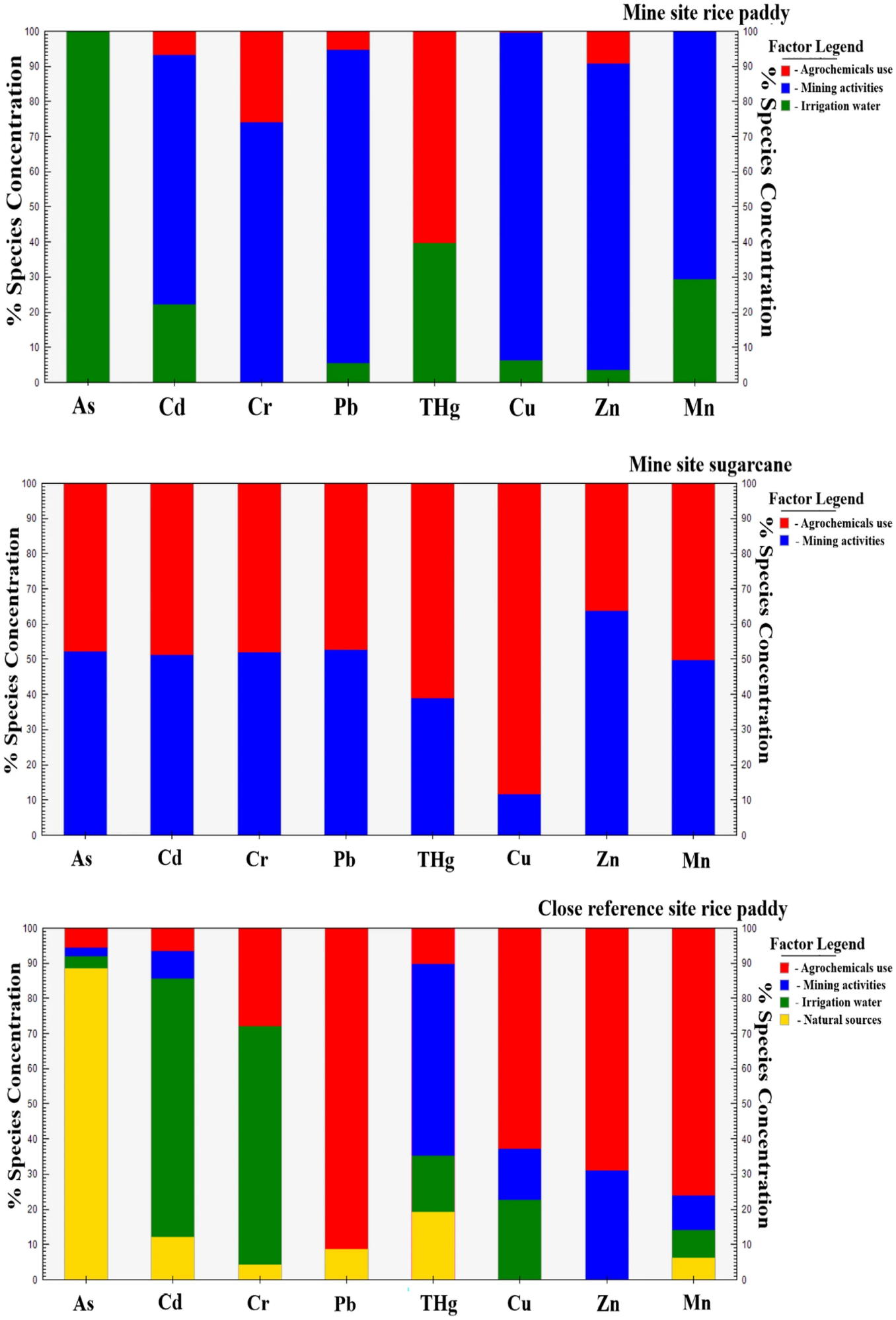 受体模型结果表明,采矿活动是矿区水稻农业生态系统中各金属的主要来源(占比60.7%),其次是灌溉用水(25.8%),农用化学药品最少(13.5%)。在近矿区对照点,农用化学药品对各金属的贡献最大(42.8%),其次是灌溉水(22.7%)和自然来源(17.4%),采矿活动贡献最小(17.2%)。在远矿区对照点,农用化学药品对各金属的贡献最大(40.6%),其次是灌溉用水(32.5%)和自然来源最小(26.9%)。在甘蔗农业生态系统中,农用化学药品对矿区和近对照点各金属的贡献最大(分别为50.1%和57.4%),其次是采矿活动(分别为49.9%和42.6%)。在远矿区对照点,农用化学药品是各金属的主要来源(51.2%),其次是自然来源(48.8%)。