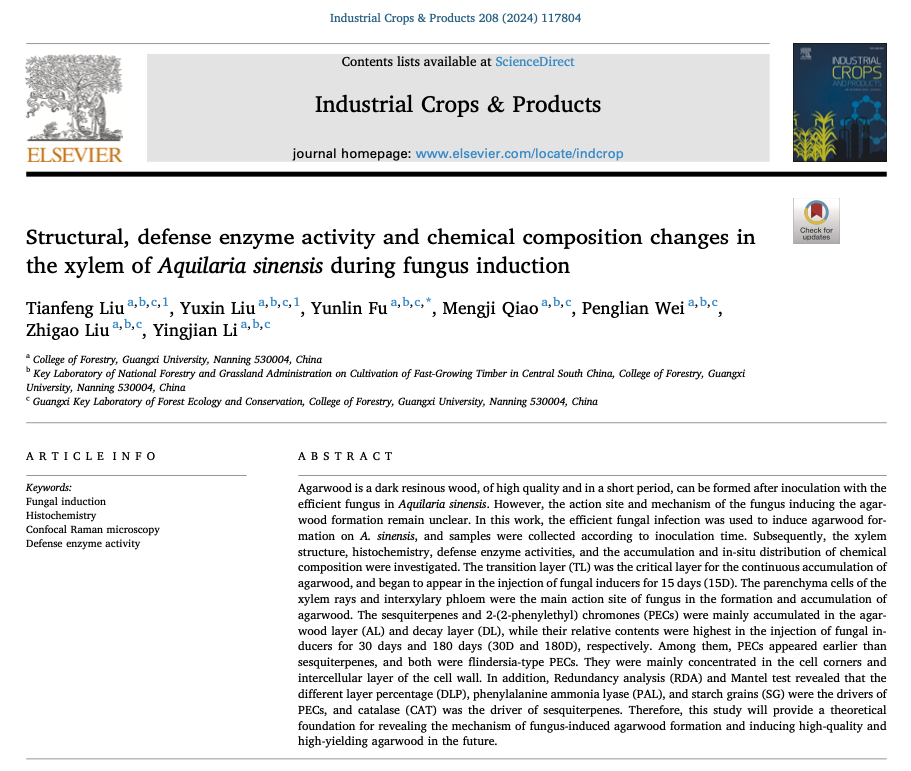 近日,3044永利集团符韵林教授团队在真菌诱导白木香结香机制方面的研究成果《Structural, defense enzyme activity and chemical composition changes in the xylem ofAquilariasinensisduring fungus induction》(白木香木质部在真菌诱导过程中的结构、防御酶活性和化学成分的变化),发表于农林科学领域期刊Industrial CropsandProducts(中国科公司一区Top,IF=5.9)。公司生态学博士研究生刘天凤、已毕业硕士研究生刘羽心为论文共同第一作者,符韵林教授为通讯作者。该研究得到了国家自然科学基金(32171702)的支持。