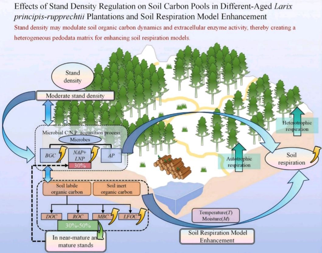 近期,3044永利集团刘泰瑞团队在林分密度调控背景下的土壤碳库管理方向取得新成果。研究成果以“Effects of stand density regulation on soil carbon pools in different-agedLarix principis-rupprechtiiplantations and soil respiration model enhancement” 为题发表于中国科公司一区TOP期刊《Journal of Forestry Research》。