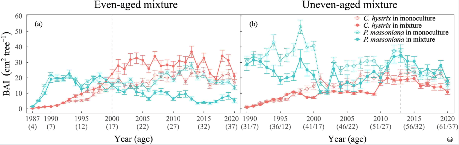 团队采用树木年轮学方法,在个体水平(共286株树木)重建了马尾松(Pinus massoniana)和红锥(Castanopsis hystrix)组成的同龄混交林(EMs)和异龄混交林(UEMs)及其相应的纯林的37年生长序列。结果显示,1)在EMs中,相较于纯林,马尾松和红锥的生长量分别降低20.8%和提高26.2%。然而,在混交的前17年内,马尾松的生长量并未受到显著影响,但在此之后则明显受到红锥的抑制。2)在UEMs中,马尾松与红锥的生长量较其纯林分别下降20.8%和26.2%,但随着混交时间延长,马尾松在混交30年后由受抑制转为受促进。3)UEMs中马尾松的相对生长量随旱季降水量增加而提升。总体而言,异龄混交有助于在长期尺度上促进树木生长,并提高林分应对未来降水变化的适应能力。而对于同龄混交林,应在生长快速且不耐荫的树种经历强烈光竞争之前实施间伐。研究结果以“Tree species mixing effects on the radial growth ofPinus massonianaandCastanopsis hystrix: A comparison between even-aged and uneven-aged stands”为题发表在Forest Ecology and Management(Top期刊,农林科学领域2区)上,研究团队2023级博士研究生陈仁杰为论文第一作者,申卫军教授为论文通讯作者。原文链接:https://doi.org/10.1016/j.foreco.2024.122058