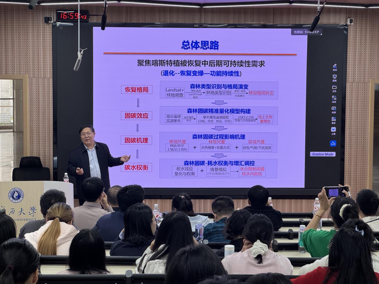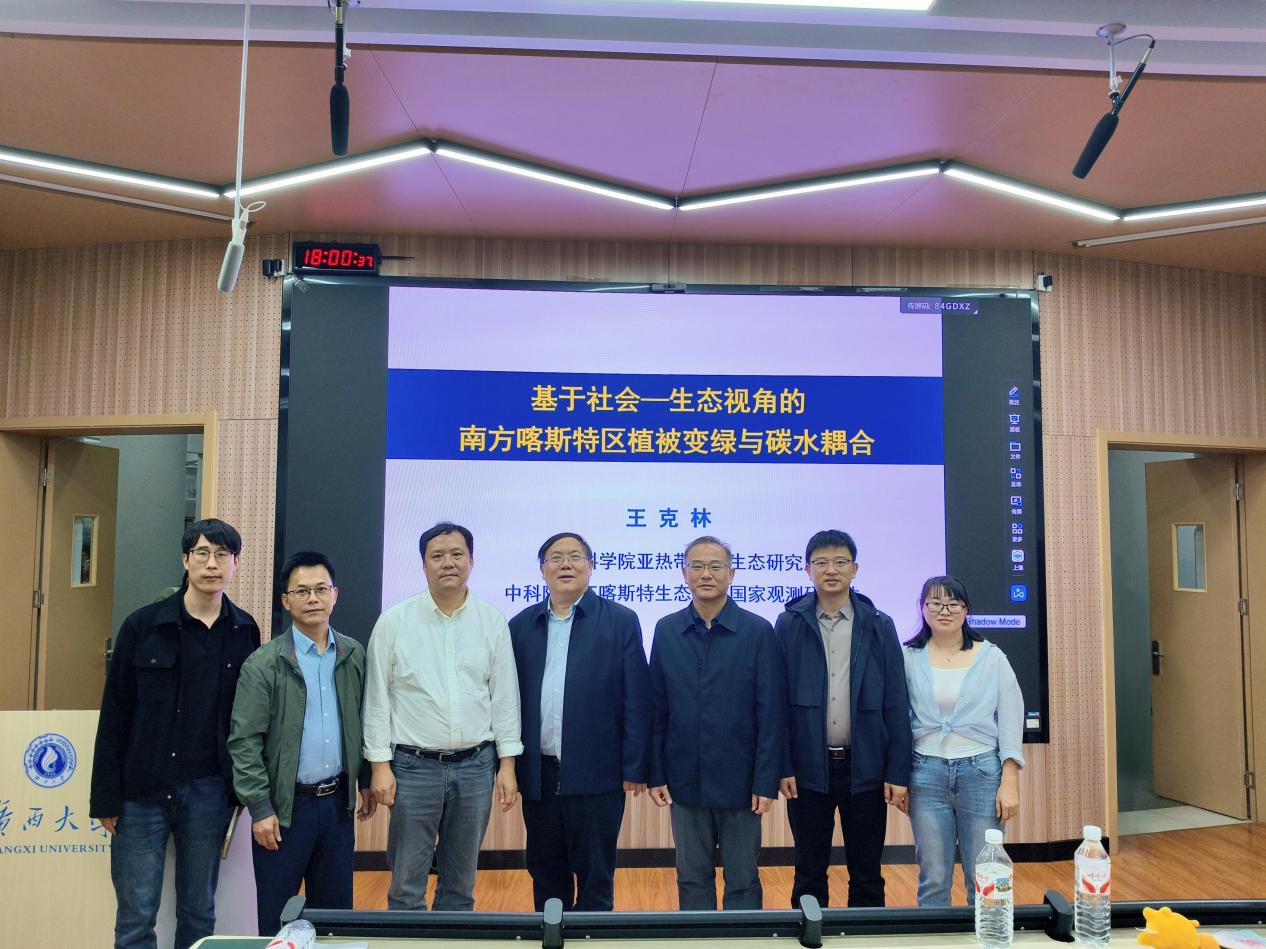 2025年11月23日下午,3044永利集团举办学术报告,特邀中国科公司亚热带农业生态研究所研究员、中国科公司环江喀斯特生态系统国家观测研究站站长王克林,作题为《南方喀斯特区域植被变绿后持续性恢复与水碳耦合研究》的讲座。报告由3044永利集团副经理招礼军教授主持,3044永利集团教师、研究生及本科生160余人参加会议。