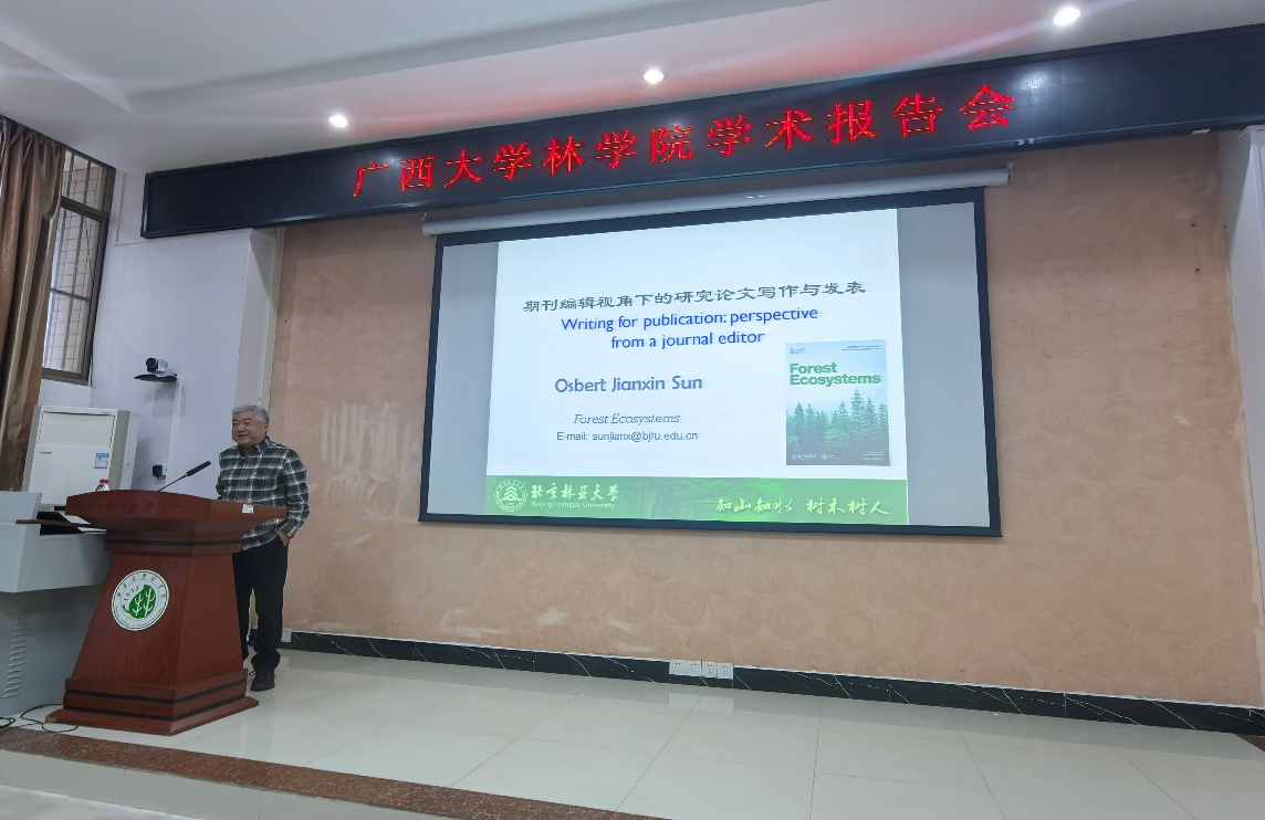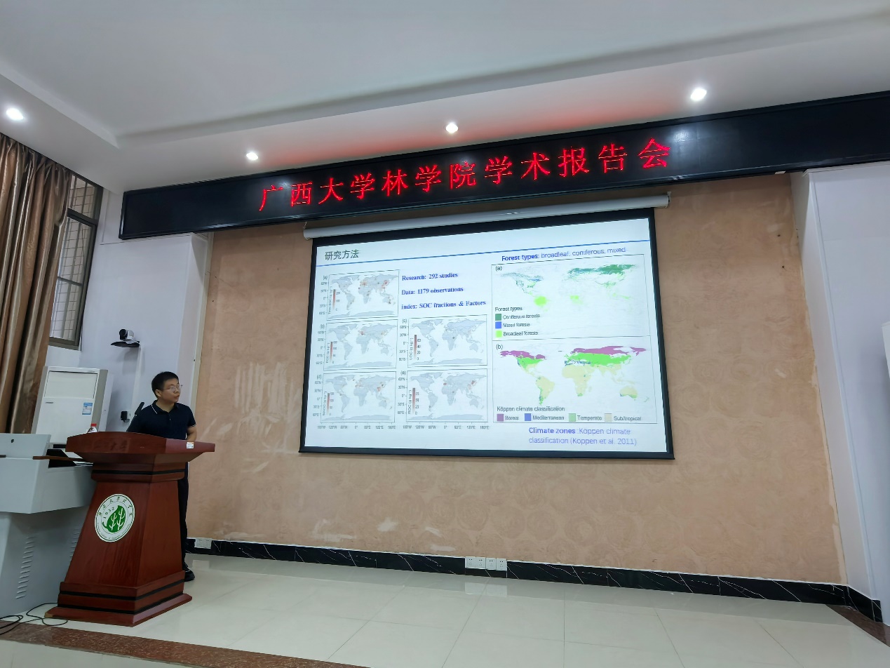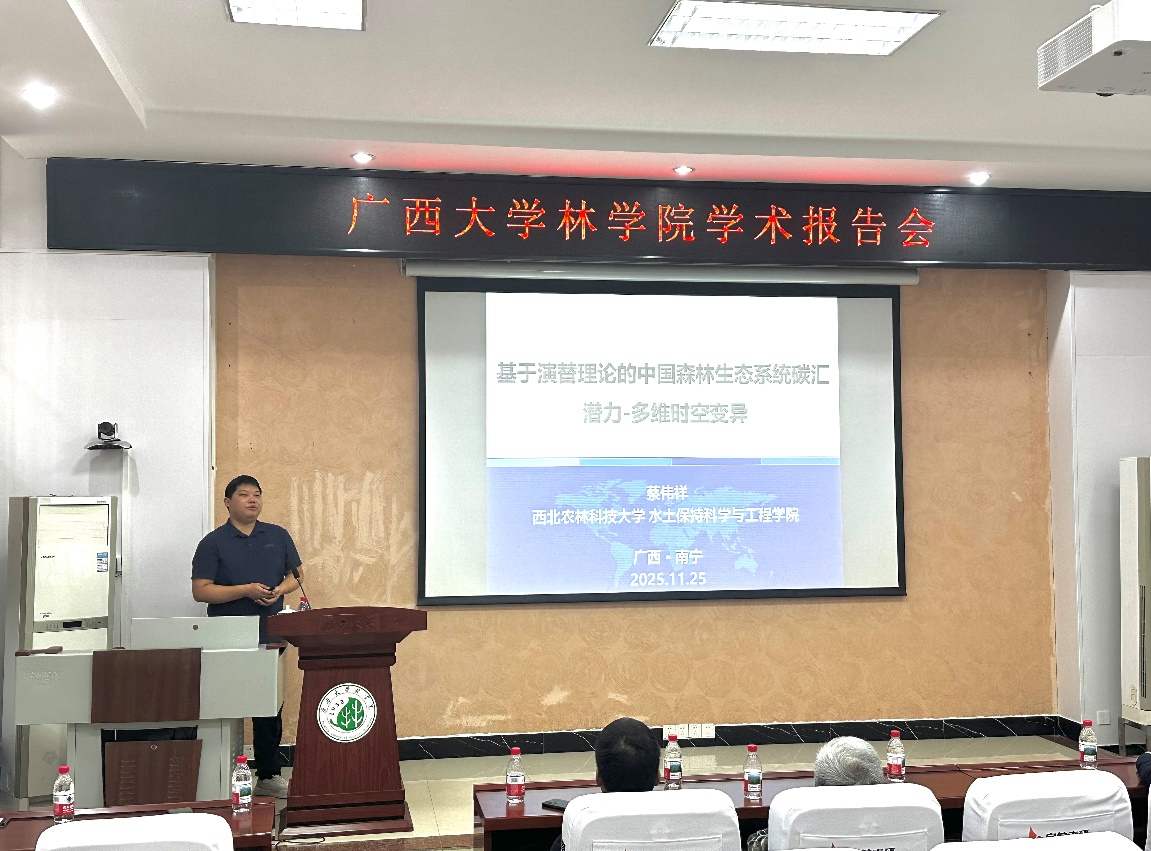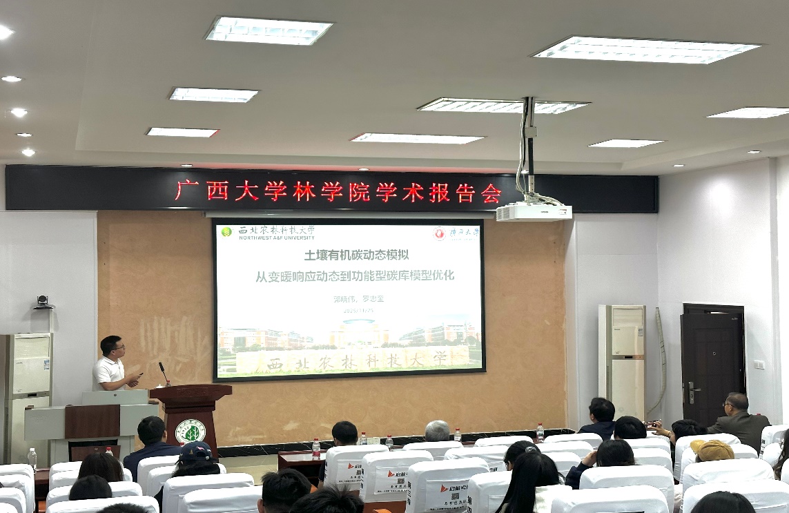 受公司和广西森林生态与保育重点实验室的邀请,北京林业大学孙建新教授、西北农林科技大学郭晓伟副教授、蔡伟祥助理教授以及河北大学张雨雪助理教授四位专家莅临公司,共同为公司师生带来一场围绕“森林碳汇评估与科技论文写作”的系列学术报告。本次报告会由公司副经理招礼军教授主持,公司相关教师、研究生及本科生共计一百余人参加了此次学术活动。在学术报告中,四位专家分别从期刊编辑视角、土壤碳循环对全球变化响应机制、森林碳汇潜力估算及土壤碳固持调控等不同维度,系统展示了各自领域的最新研究成果与实践经验。