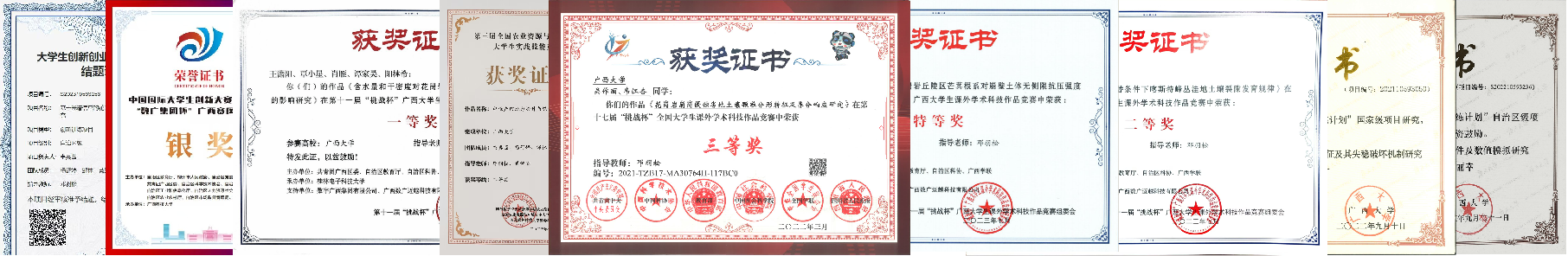 优秀学子尽展风采:近五年累计15人次获国家级奖学金,多人获评优秀员工干部,实现了科研能力与综合素养同步提升,20余名本科生保送至中国科公司大学、厦门大学等知名院校深造。其中,2018级生态学专业吴作丽参与国家自然科学基金(42007055),在本科期间以第一作者在地球科学领域一区TOP期刊《Catena》上发表论文,实现公司在本科生发表高水平论文的历史突破,成功保送中科院深造,研一期间,在领域内顶尖期刊《Earth-Science Reviews》上发表论文,展现出持续的科研突破能力。2020级生态学专业王超自大加入课题组,通过课程学习与中国科公司科研项目的深度融合,迅速成长为团队科研骨干;主持申报国家级大创项目并以“优秀”结题,以第一作者发表SCI论文2篇,授权专利得到应用;2023年获“挑战杯”广西区赛特等奖及“互联网+”区赛奖项,先后获得自治区人民政府奖学金、何康农业奖学金、梁希优秀学子奖及校“十佳员工”等荣誉,以优异成绩考取中国科公司地理科学与资源研究所硕士研究生。2023级生态学本科生张诗琴、石静琴通过参与国家自然科学基金(4246704132460424)和国家重点研发课题(2023YFD1902801),各发表1篇论文,分别荣获自治区人民政府奖学金、何康农业奖学金和国家奖学金。