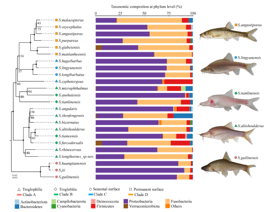 图1.金线鲃的系统发育关系、肠道菌群组成以及代表性物种图片