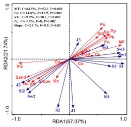 研究发现,白云岩峰丛洼地不同地貌部位呈现出强烈的土壤性质和结构差异,导致其土壤类型在较短的水平距离内逐步过渡,形成明显的土链格局,从上坡到洼地土壤类型表现为:新成土-初育土-半淋溶土-淋溶土。同时,土壤类型与主要的植被群落存在空间对应关系(图2),即植被群落从上坡到洼地表现为:草-草灌-灌乔-乔木。冗余分析表明细土质量占比对植被多样性的变化贡献最大(图3);并通过结构方程模型进一步分析地形、土壤、植被三者之间的关系,结果表明坡度间接控制植被多样性,养分中的有机质和全磷贮量直接影响植被群落多样性。