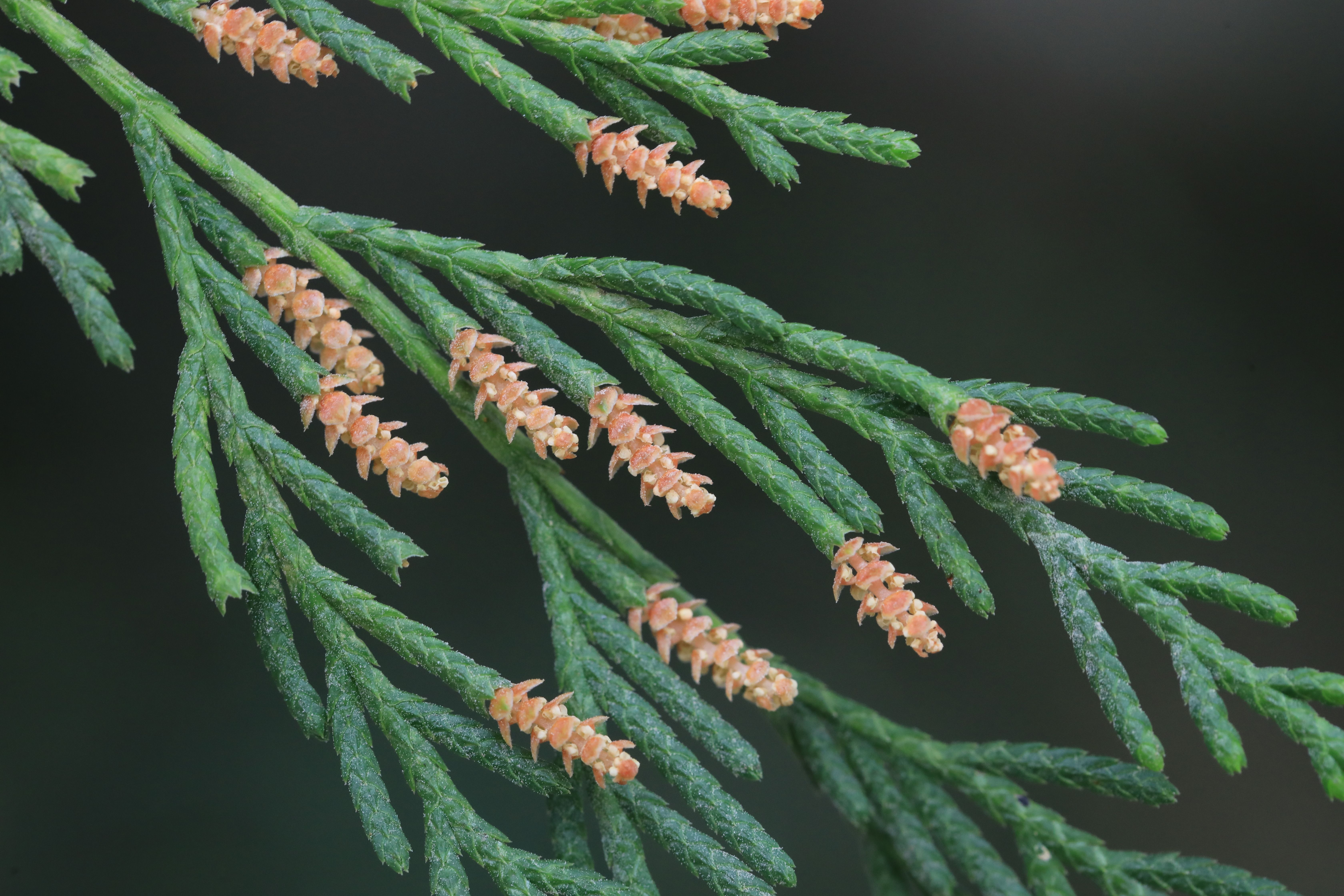 常绿乔木,树形挺拔优美,树干通直,树皮呈灰褐色,长条状剥落,生鳞叶的小枝扁,排成一平面,下垂,两面同形。鳞叶二型,先端锐尖,两侧的叶对折,背部有棱脊。雌雄同株,球花单生于小枝顶端,雄球花椭圆形或卵圆形,雄蕊通常6对;雌球花近球形。球果翌年夏季成熟,球形,熟时褐色。
