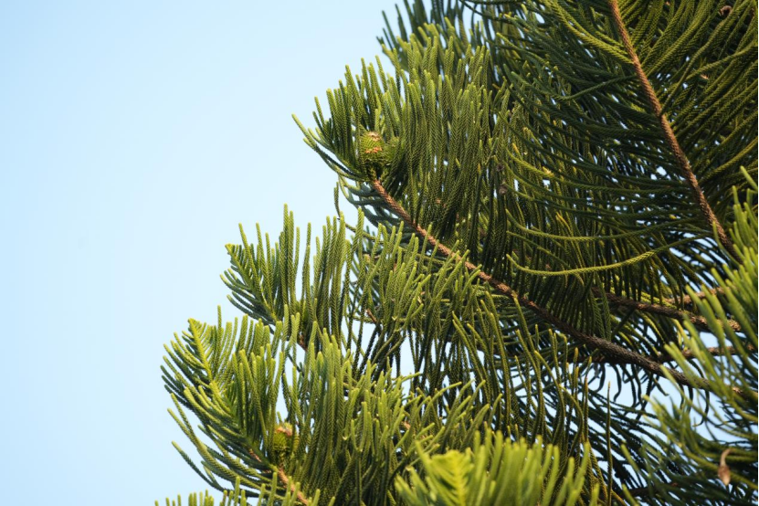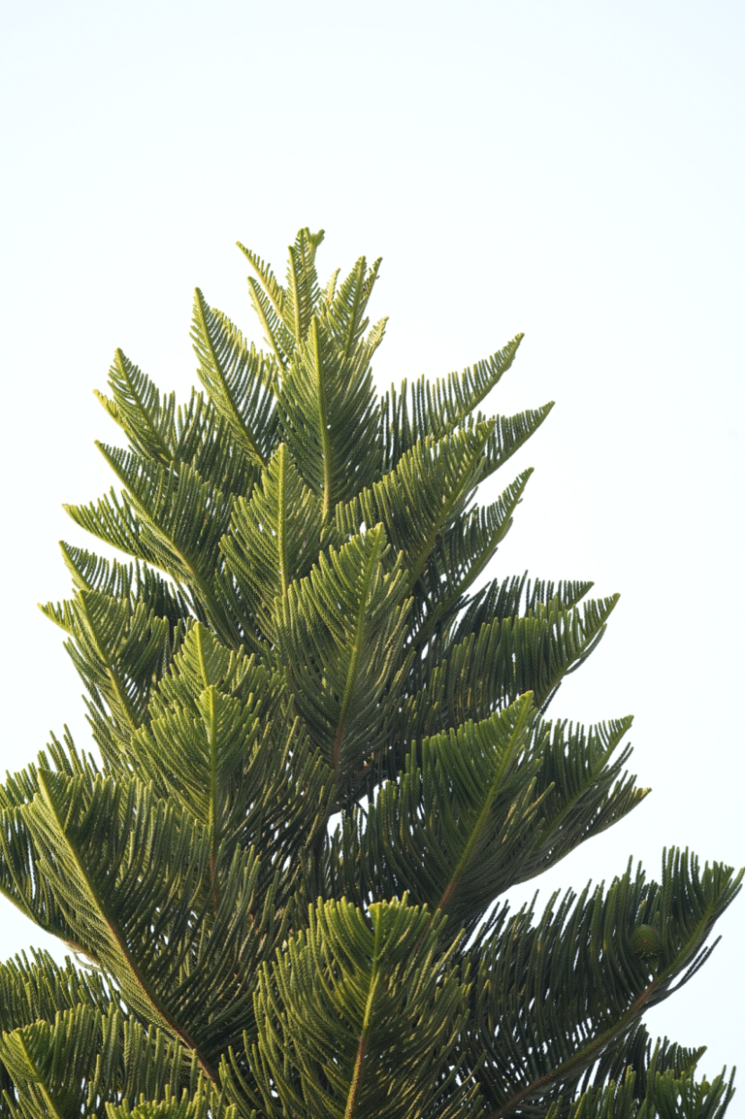 南洋杉树形高大,可达60-70米,树干通直,姿态优美,犹如一把巨伞直插云霄。它的树冠呈尖塔形,层次分明,枝条轮生,向四周伸展。叶片呈针状或鳞片状,质地坚硬,紧密排列在枝条上,四季常绿,在阳光下闪烁着光泽,尽显蓬勃生机。