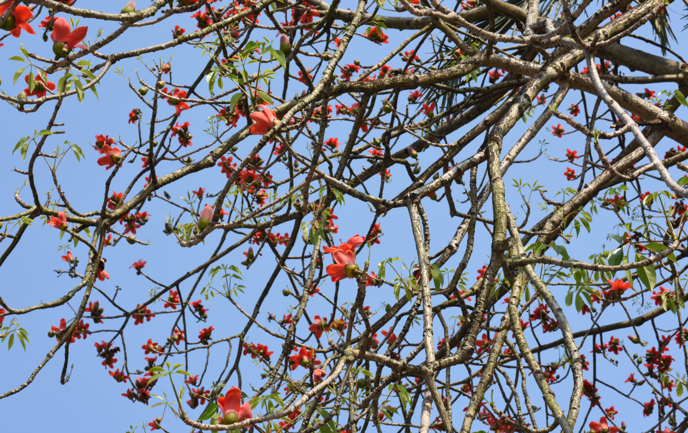 木棉最令人惊叹的是其壮观的花期。每年3-4月,光秃的枝头会绽放出直径约10厘米的硕大花朵,花瓣5枚,肉质,呈鲜红色或橙红色,有时也会出现罕见的黄色变种。花朵簇生于枝端,盛开时整棵树如同燃烧的火炬,蔚为壮观。这种先花后叶的特性使木棉花格外醒目,成为南国春天最耀眼的风景。